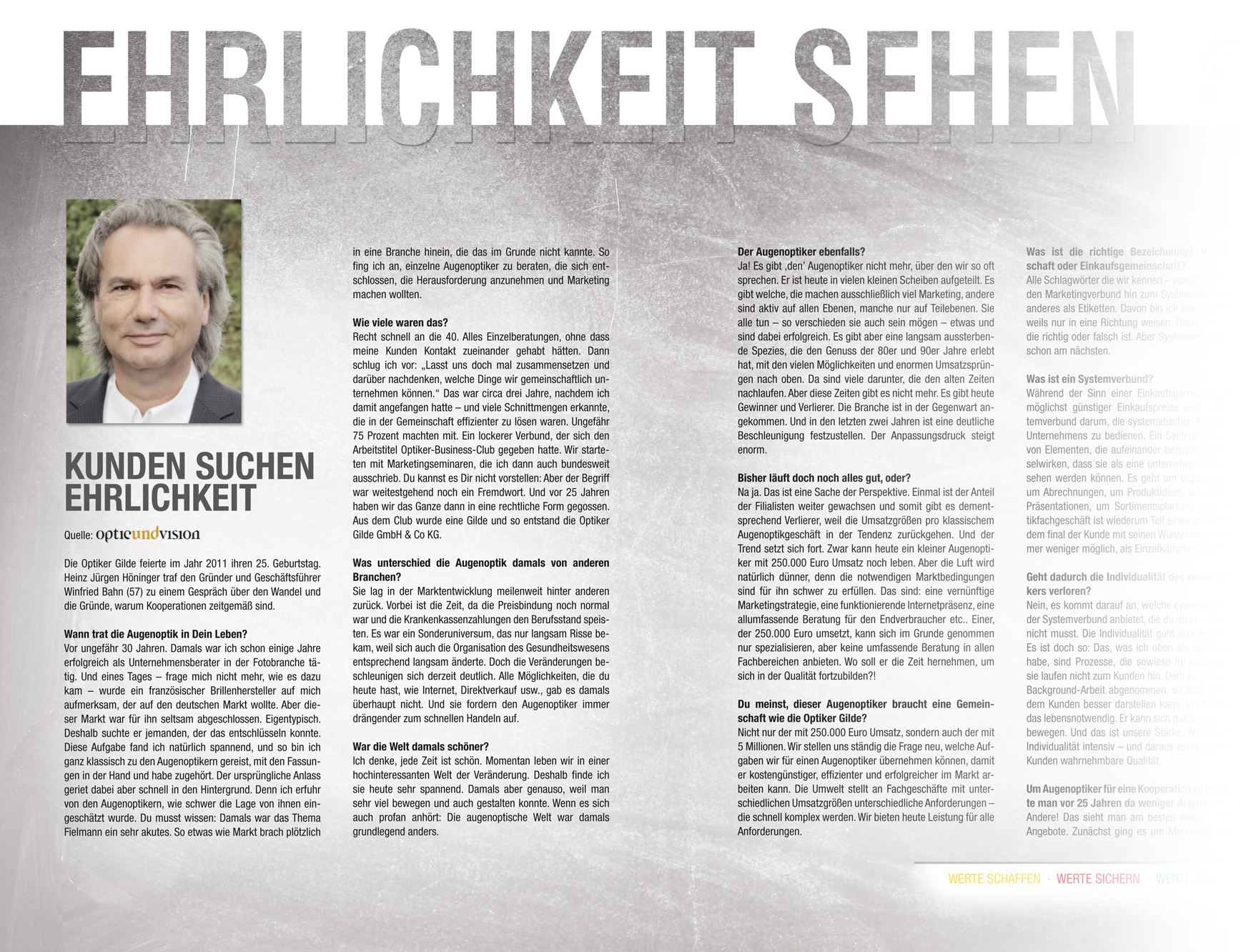 Wenn heute der eine Markt schreit: 39 Euro, der zweite: 29 Euro und der dritte: 19 Euro – dann bekommen nicht wenige die Sorge und meinen, genauso reagieren zu müssen. Schließlich verlassen sie dann ihre eigene Strategie. Dabei fühlen sie sich allerdings nicht wohl, tun es aber trotzdem. Sie ziehen nach und reflektieren die Folgen nicht, dass sie auch sich selbst gegenüber untreu und unehrlich werden. Und dann verlieren sie den inneren Halt, ja, die Würde. Denn sie wollen im Grunde eine solche Leistung gar nicht anbieten, nicht mit dem fallenden Preis gemeinsam abstürzen. Aber sie tun es. Das merkt der Kunde auf Dauer immer. Nehmen wir das Trudeln der Commerzbank als Beispiel: Sie ist die große Verliererin der Bankenlandschaft. Wenn du heute für eine Kontoeröffnung 50 Euro geschenkt bekommst und alle Buchungen umsonst sind... Ist das gut?! Oder dem einen wird 2,5 Prozent gegeben, wenn er frisches Geld bringt – und die Altkunden werden benachteiligt. Sie bekommen diese 2,5 Prozent nicht. Das rächt sich auf Dauer. Der Konsument registriert das und verabschiedet sich anschließend. Dann geht er ins Internet, sucht die Preisverhandlung. Unser Handel tut im Moment vieles für das Internet, eine Welt ohne Menschen. Dabei könnten wir so viel tun für unsere Fachgeschäfte, einer Welt mit Menschen; wenn man sich entsprechend ehrlich verhalten würde. Es ist wichtig, dass wir das einlösen, was wir versprechen – auch uns selbst gegenüber. Wir sollten zur Leistung, die wir erbringen, vollends, auch innerlich, stehen. Das gilt natürlich ebenso für uns in der Optiker Gilde. Wir liefern, was wir versprechen. Das heißt Verlässlichkeit ist ein nicht unwesentlicher Grund, warum wir seit 25 Jahren erfolgreich sind.Ausblick